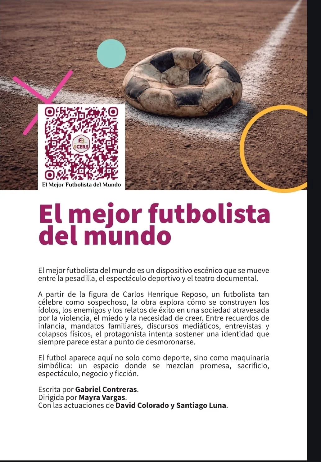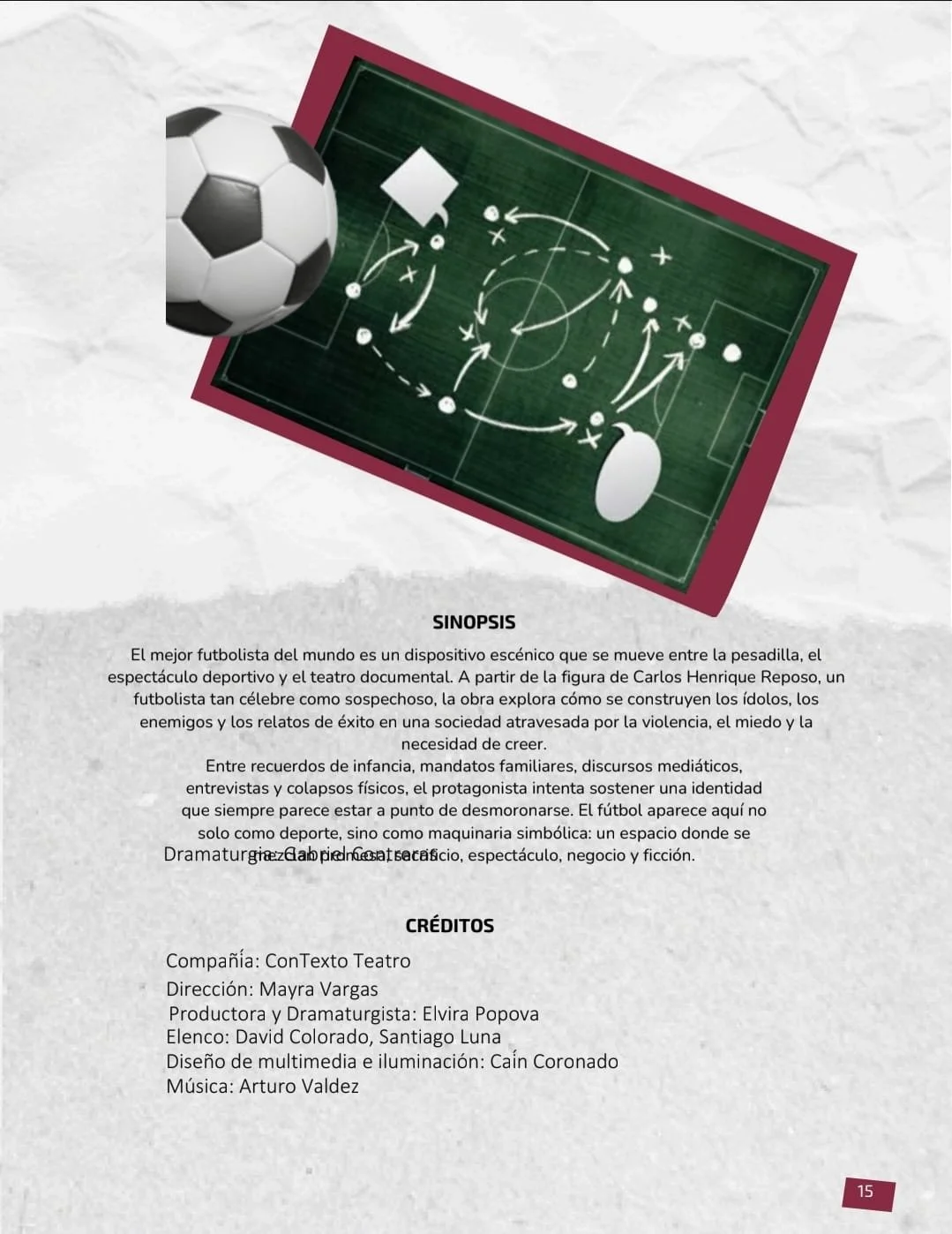 El mejor futbolista del mundo es un dispositivo escénico que se mueve entre la pesadilla, el espectáculo deportivo y el teatro documental. A partir de la figura de Carlos Henrique Reposo, un futbolista tan célebre como sospechoso, la obra explora cómo se construyen los ídolos, los enemigos y los relatos de éxito en una sociedad atravesada por la violencia, el miedo y la necesidad de creer.